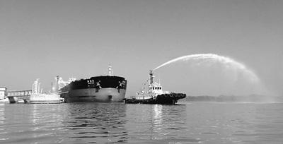 中缅原油管道试运行仪式现场,油轮鸣笛、水炮喷涌,一片喜庆气氛。本报记者 王天乐摄