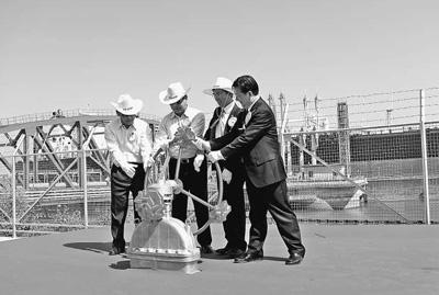 在马德岛泵站控制室前,缅甸能源部长吴泽亚昂、中石油集团总经理廖永远、中国驻缅甸大使杨厚兰和若开邦省长吴貌翁共同转动控制阀门。从“新润洋”油轮卸下的来自中东地区的原油,首次从印度洋登陆缅甸,注入中缅原油管道马德岛首站的储罐内。本报记者 王天乐摄