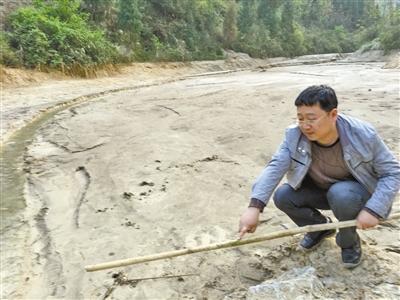 万州区法院环境保护审判庭副庭长王翔用竹竿丈量4家开矿企业直排造成的淤泥深度。 重庆晨报记者 郎清湘 摄