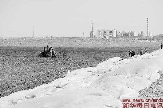 下图:4月29日,在宁夏回族自治区中卫市瑞泰化工有限公司,工人在将原先存污水的戈壁滩地上残留的污泥装袋准备进行无公害处理。
