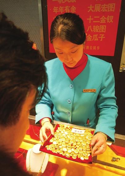 据中国黄金协会日前发布的数据显示,2015年一季度,中国黄金消费326.68吨,与去年同期相比增加3.69吨,增幅为1.14%。与去年同期相比,首饰制造用金降低了约6吨,金条及金币微增1.39吨,黄金需求基本持平。尽管国际金价低迷,中国黄金消费保持小幅增长。图为消费者在商场选购黄金饰品。