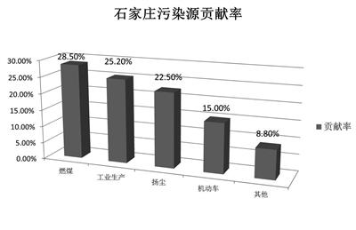 由于灰霾天气频发以及PM2.5污染日益引起社会关注,河北省其余10市从2013年起陆续开展大气污染源解析,石家庄走在前列。2014年8月29日,石家庄率先向社会发布空气颗粒物来源解析结果:石家庄市PM2.5的23%~30%为外地输入,70%~77%来自石家庄本地污染。本地各类污染源排放分担率为:燃煤28.5%、工业生产25.2%、扬尘22.5%、机动车15.0%、其他8.8%。