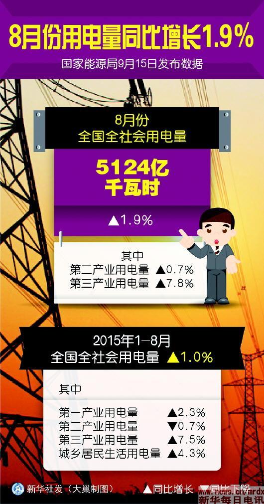 8月份用电量数据15日对外发布,全社会用电量同比增速从上个月的-1.3%回升至1.9%。综观8月份用电量各项数据,增速回升折射我国经济在波动中回稳,而用电量结构持续改善更显示我国经济结构调整成效逐步显现。