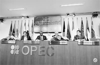 图②:石油输出国组织(OPEC)部长级会议2015年12月4日在奥地利首都维也纳举行,会议并未明确公布欧佩克原油产量限额,称限额问题将在下次会议中讨论。图为欧佩克秘书长巴德里(右二)和新任轮值主席、尼日利亚石油资源部长卡希库(左二)出席新闻发布会。