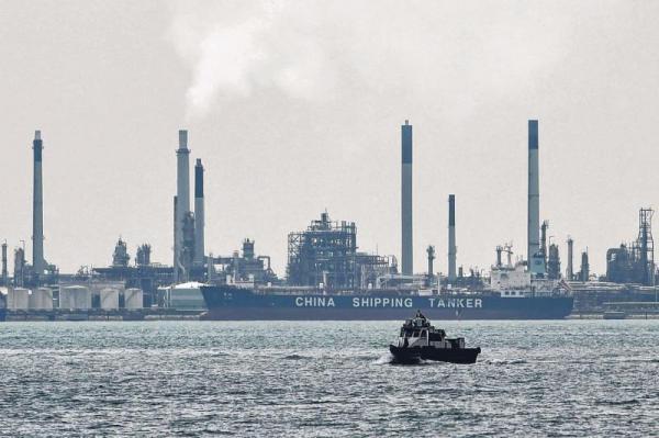 今年1月间一艘油槽船停泊于毛广岛炼油厂附近,当时布伦特原油期货每桶跌至28美元以下,那是超过12年来第一次跌至这个水平。(法新社)