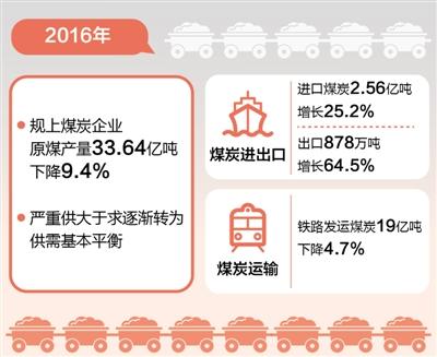 本报北京1月23日电 (记者刘志强)23日,中国煤炭工业协会对外发布了2016年煤炭行业经济运行情况。根据统计数据,2016年全国规模以上煤炭企业原煤产量33.64亿吨,同比下降9.4%。随着去年年初煤炭去产能和煤矿减量化生产政策实施,4月份起产量降幅超过10%,全国煤炭供需形势由严重供大于求逐渐转为供需基本平衡;9月份以来,煤炭产能逐渐释放,产量环比增加,降幅不断收窄。