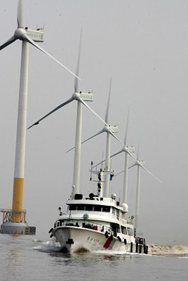 2月22日,上海海事局洋山海事处的巡逻艇正在安装了风力发电机的海域巡视。上海东海大桥100兆瓦海上风力发电示范工程,是我国第一个由国家发改委正式核准并列为示范项目的大型海上风电项目,也是亚洲首座海上风力发电场,目前海上34台风机安装已进入尾声,预计于今年5月1日前并网发电。