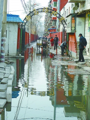 据居民介绍,西马场北里只有这一条东西走向的胡同,居民出门、购物都必须走这条路。可现在路面每天汩汩往外冒臭水,人们只好用方砖沿着胡同北面铺了一条窄路勉强通行,而现在那些方砖也被臭水淹没了,居民通行更加困难。