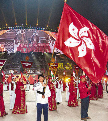 黄金宝将手持特区区旗走进北京奥运会。图为多哈亚运会。(图片来源:文汇报)
