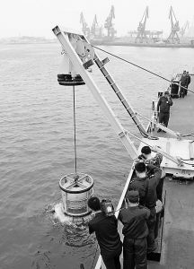 安装在救生船后甲板的“水下机器人”通过专用吊车迅速潜入海中。遥控方舱内,士官廉法响、李明根据指令,娴熟地操纵着遥控手柄,“水下机器人”在水中灵活机敏地游动搜寻开去。