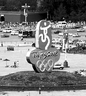 2日,已摆放完毕的奥运标志花坛竖立在天安门广场中央。