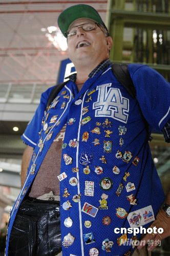 8月4日,来自美国加里福利亚的Brad Frank在北京机场展示其收集的奥运会纪念章,据其介绍,他有上万枚纪念章,是个名副其实的奥运迷。中新社发 王东明 摄