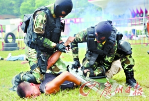 房间内“歹徒”劫持2名人质,12名边防特勤突击队员正在突击解救!昨日上午,在北京奥运会即将开幕之际,广东边防总队在该总队七支队训练基地举行大型反恐演练,该演练以边境辖区反恐和处置突发事件为作战背景。