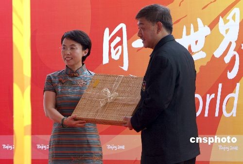 图为菲律宾奥运代表团团长Julian Camacho和北京奥运村值班村长程红(左)交换礼品。