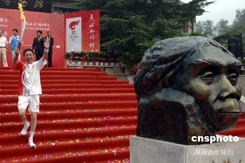 8月8日清晨7时,第29届夏季奥运会的火炬,从周口店遗址出发,开启最后一天的传递。图为“笑星”冯巩在北京人发源地周口店传递奥运火炬。 中新社发 王东明 摄