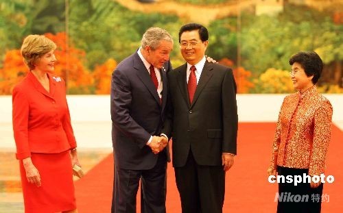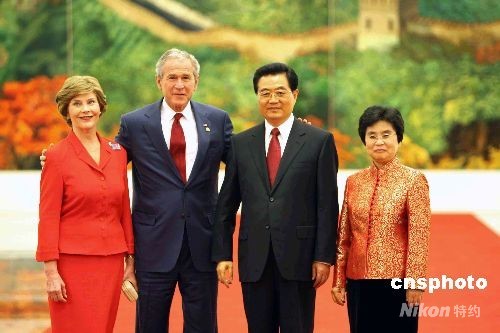 图:胡锦涛夫妇欢迎美国总统布什夫妇