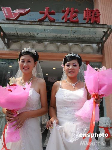 8月8日,两位化好妆的“奥运新娘”身披婚纱走出影楼。当日,安徽的“奥运新娘”们纷纷走进影楼化妆造型,挑选婚纱,为晚上的婚礼精心装扮,她们要以自己最美丽的形象,迎接一生中最幸福的一天。 中新社发 陈超平 摄