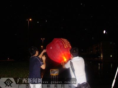 7日晚,南宁部分中学的一些学生在南宁市民生广场举行七夕放飞孔明灯活动,活动以“为灾区祈福、为奥运加油”为主题。笔者在民生广场上看到,由同学们自己出资购买的150盏孔明灯被先后点燃,缓缓地飘向无边无际的夜空,不少同学将自己的祝福与心愿写在灯上。
