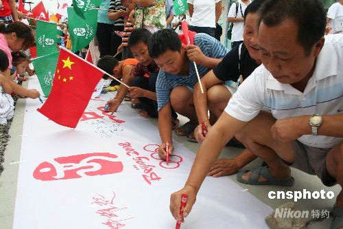 8月8日上午,“点燃激情、传递梦想,安县明天更美好”的千人签名活动在四川地震重灾区安县举行。临时安置点里人头攒动,男女老少纷纷拿笔祝福北京奥运。 中新社发 钟述强 摄