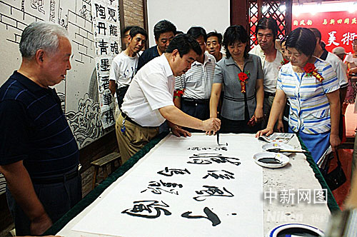 中新网8月8日电(冯文芳)8月8日,举国同庆2008奥运会召开,山西侯马与襄汾展开文化互动,举办了“襄汾县书法、美术作品侯马邀请展”,两地艺术家们齐聚侯马晋博园内,共同挥毫泼墨庆奥运。