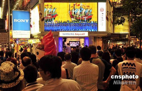 八月八日晚上,香港大批市民在铜锣湾闹市街头上,观看大屏幕电视直播的奥运开幕盛况。中新社发 谭达明 摄