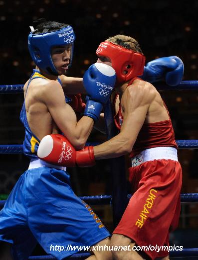 8月11日,中国选手胡青(蓝)在拳击男子轻量级60公斤级比赛中战胜乌克兰选手亚历山大·克柳奇科,顺利晋级下一轮。这是双方选手在比赛中。新华社记者陈燮摄