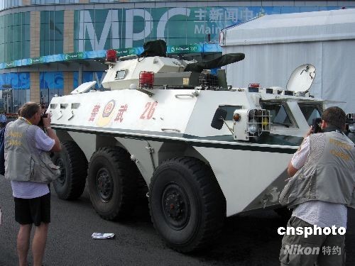 8月12日,一辆停在北京奥运会主新闻中心的前的武装巡逻车引起了许多媒体的注意。中新社发 杜洋 摄