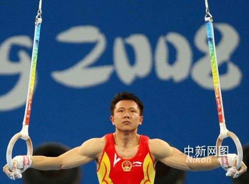8月12日上午,由杨威领衔的中国男子体操队在北京奥运会体操比赛馆开始向金牌冲击。图为中国“吊环王”陈一冰在吊环比赛中获得最高分。中新社发 任晨鸣 摄