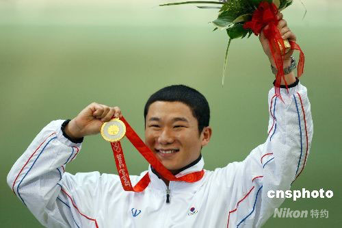 8月12日,北京射击馆进行的北京奥运会男子50米手枪决赛中,韩国选手秦钟午发挥出色,以660.4环的成绩夺得冠军,朝鲜选手金荣洙最后一枪超越谭宗亮获得银牌,成绩为660.2环,中国选手谭宗亮最终以659.5环收获一枚铜牌。中新社发 盛佳鹏 摄