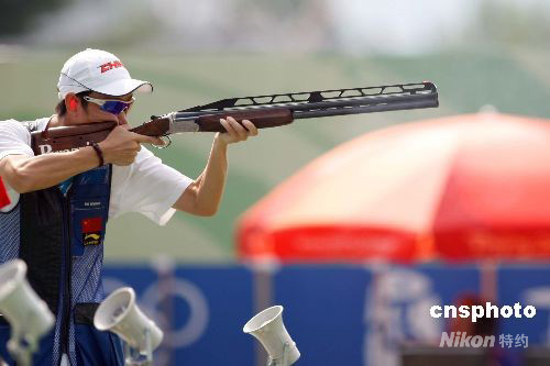 8月12日,北京奥运会男子飞碟双多向决赛在北京射击馆进行,中国选手胡斌渊以资格赛第四的身份进入决赛,以184中获得铜牌。美国选手格伦·埃勒以190中获得金牌,意大利选手弗朗切斯科·达尼埃洛以187中获得银牌。图为胡斌渊在比赛中。 中新社发 盛佳鹏 摄