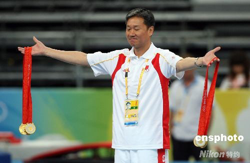 8月12日,中国体操队在北京奥运会体操男子团体比赛中以286.125 分勇夺金牌。图为总教练黄玉斌体味冠军滋味。 中新社发 武仲林 摄