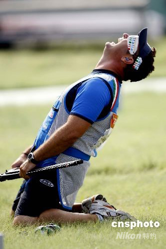 8月12日,北京射击场飞碟靶场进行的奥运会男子飞碟双多向的决赛中意大利选手弗朗切斯科·达尼埃洛总分187中获得银牌。 中新社发 盛佳鹏 摄