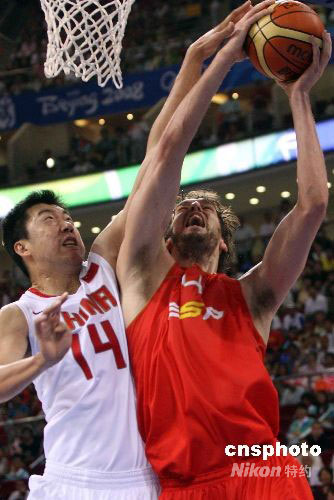 北京奥运会男子篮球小组赛第二轮赛事8月12日打响,首战负于“梦八队”的中国男篮在姚明率领下向世锦赛冠军西班牙队发起猛攻,上半场结束,中国以46比37领先。图为王郅治封盖加索尔的扣篮。中新社发 任晨鸣 摄