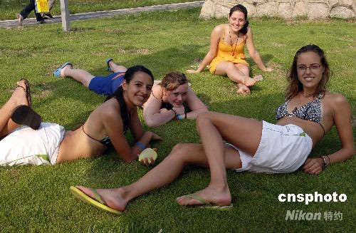 8月12日,前来参加北京奥林匹克青年营的外国靓女正在享受“日光浴”。北京奥组委举办的奥林匹克青年营吸引全球205个国家(地区)的奥委会全部派代表参加,实现了历届青年营之最。 中新社发 王东明 摄