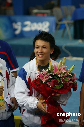 8月12日下午,女力士卢映锜为中华台北举重队摘得北京奥运会第二枚铜牌。北京奥运会女子举重六十三公斤级比赛中,她以二百三十一公斤的总成绩,获得第三名。 中新社发 沈晨 摄