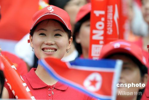 8月12日下午,奥运女足小组赛进行到第三轮,朝鲜女足和德国队的较量在天津“水滴”体育场进行,亚洲冠军朝鲜队和世界冠军德国之间为出线决一胜负。图为朝鲜女球迷天津助威。 中新社发 陈文 摄