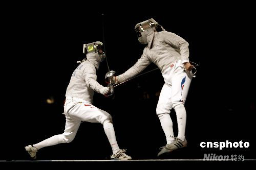 8月12日,2008年北京奥运会男子佩剑个人赛半决赛,25岁的中国选手仲满(左)杀进决赛。 中新社发 盛佳鹏 摄