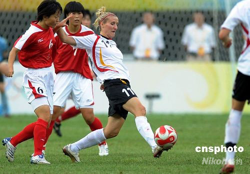 8月12日下午,奥运女足小组赛进行到第三轮,朝鲜女足和德国队的较量在天津“水滴”体育场进行,德国队以1:0胜朝鲜队。中新社发 陈文 摄