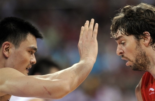 北京奥运会男子篮球小组赛第二轮赛事8月12日开始,首战负于“梦八队”的中国男篮在姚明率领下向世锦赛冠军西班牙队发起猛攻,在一路领先的大好局面下被西班牙队在终场时扳平,经过加时赛以75比85告负。中新社发 任晨鸣 摄