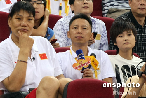 8月14日下午,北京奥运会男子篮球小组第四轮赛事在北京五棵松篮球馆举行,同为两战两负的中国队与安哥拉队展开“生死大战”。昔日中国女篮超级中锋、身高2.04米的郑海霞,超女李宇春等到场为中国队助威。 中新社发 任晨鸣 摄