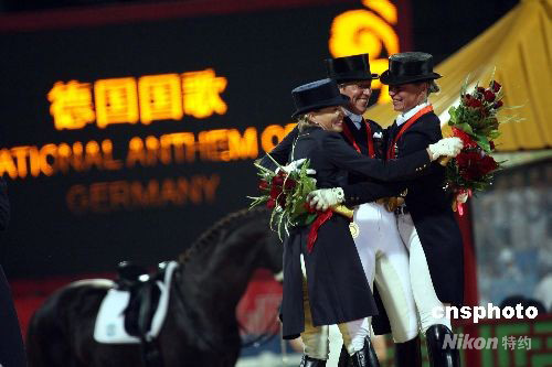八月十四日晚,奥运马术盛装舞步团体赛及个人赛在香港沙田赛场举行,并决出团体赛金牌。德国队在马术盛装舞步团体赛发挥出色,获得该项目的金牌。中新社发 邓庆乐 摄