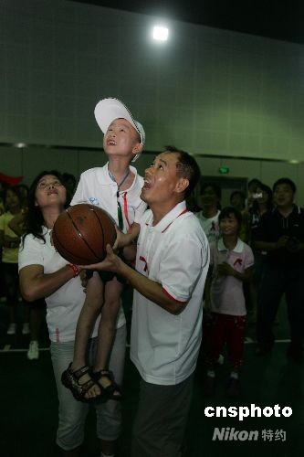 8月14日下午,李宁、杨扬和潘晓婷与艾滋孤儿玩起了羽毛球、乒乓球等体育游戏。“快乐奥运会”由李宁基金会发起,与阜阳市艾滋病贫困儿童救助协会联手,邀请阜阳的30名艾滋孤儿来到北京,观看了奥运会的射击比赛,并游览北京名胜古迹。图为李宁(右)在教艾滋孤儿打篮球。中新社发 沈晨 摄