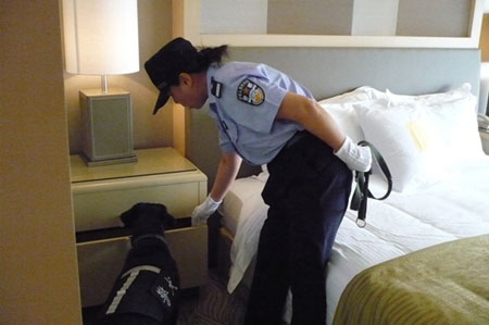 带犬民警在上海市涉奥宾馆进行安检