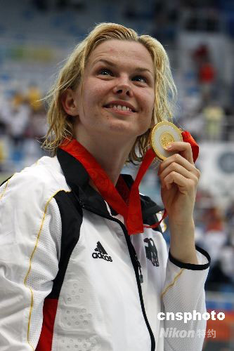 8月15日上午,在国家游泳中心水立方举行的北京奥运会女子100米自由泳决赛,德国选手布丽塔·斯特芬以53秒12获得金牌,打破之前由自己创造的奥运会纪录。 中新社发 杜洋 摄