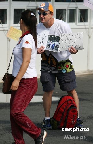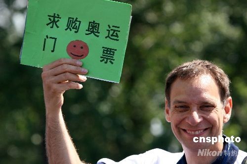 2008年8月15日,许多外国观众在国家奥林匹克公园门口打着需求各类奥运赛事门票的标牌或纸样。随着奥运赛事全面展开,前来北京观看比赛的国内外游客明显增加,由于京内比赛门票已全部售出,不少没有买到票的各国“奥运迷”,便前往各个场馆门前,期待买到别人转让的门票。位于奥林匹克中心区南端的地铁北土城站是观众前往“鸟巢”“水立方”和国家体育馆的换乘车站,现在则成为了众多求票者的“福地”。中新社发 鲁谷 摄