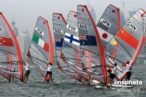8月15日,青岛奥帆中心,大型帆船托纳多级和星级首次进入比赛,中国选手首次露面。男女帆板各国选手继续激烈竞争,中国女子帆板殷剑努力拼争,试图保持自己的总排名第一位置,夺金有望。中新社发 肖冰 摄