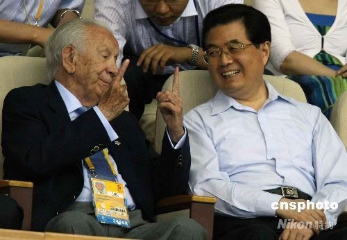 8月15日晚,胡锦涛夫妇与国际奥委会终身名誉主席萨马兰奇等到北京首都体育馆,观看北京奥运会中国与美国女排比赛。中新社发 任晨鸣 摄