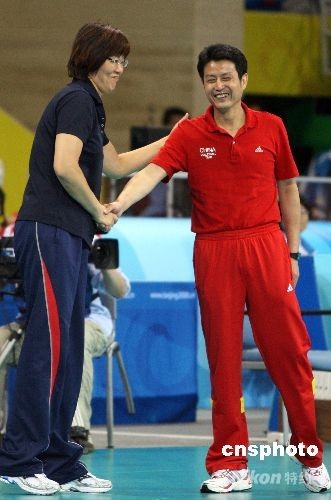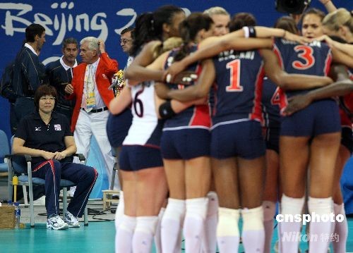 8月15日晚,北京奥运会女排小组赛中国与美国之战在北京奥运会排球比赛馆--首都体育馆举行,这场被戏称为“和平大战”的比赛最后时刻,两名美国选手封死了中国队王一梅的扣杀而以3比2战胜中国女排。中新社发 任晨鸣 摄