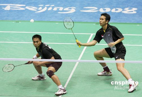 8月16日晚,印度尼西亚选手马尔基斯·基多、亨德拉·塞蒂亚万在北京奥运会男子双打决赛中以2比1战胜中国选手蔡赟、傅海峰,夺得冠军。中新社发 武仲林 摄