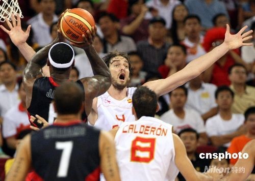 北京奥运会男子篮球小组赛第四轮比赛8月16日在五棵松篮球馆举行,同为三战三胜的美国“梦八队”、世锦赛冠军西班牙队,午夜时分展开惊心动魄的激情碰撞。最后美国队以119比82击败西班牙队。图为韦德突破加索尔兄弟的防守扣篮。中新社发 任晨鸣 摄